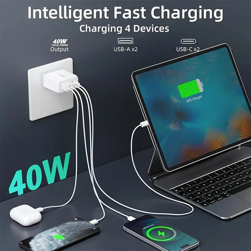 40W 4-Port USB-C Plug Fast Charger with 2 Type-C & 2 USB-A Ports, Compact Travel Design, Global Voltage 100-240V, Fast Charger Type C Cable with Adapter, Multidevice Charging Station